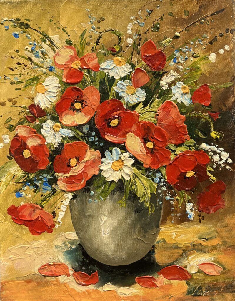 Poppies and Daisies bursts with color and vitality, offering a vivid floral still life that combines classic charm with expressive brushwork. The painting features a dynamic bouquet of bright red poppies and soft white daisies, carefully arranged in a muted ceramic vase. The earthy golden background radiates warmth, enhancing the intensity of the reds and creating a harmonious setting for the lively composition.