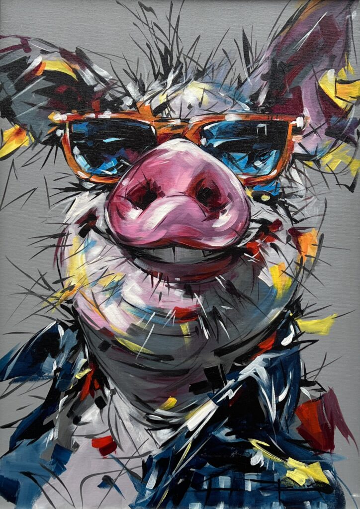 In a delightful dance of color and whimsy, this remarkable piece presents an unforgettable characterβa charming, anthropomorphic pig sporting vibrant sunglasses. Bold, expressive brush strokes weave a textured tapestry, reminiscent of the daring vibrance of expressionism. The palette is a kaleidoscope of electric blues, fiery oranges, and playful pinks, each hue harmonizing to create a figure both striking and endearing.