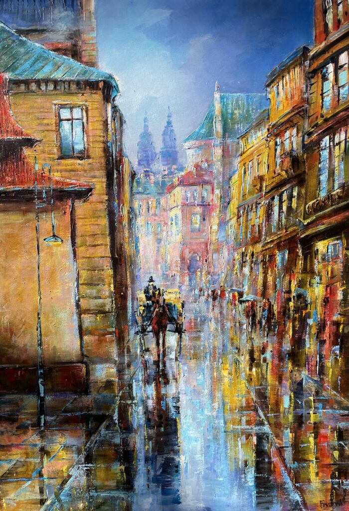 Danuta Frydrych, a talented painting artist, creates her paintings with oil paint on canvas. Her works emanate a unique atmosphere after the rain, in which strong reflections and the play of lights give them an extraordinary atmosphere. In her paintings, you can see how a raindrop flows down the glass, reflecting and blurring the light in a mysterious way. This magical moment is captured on canvas with incredible precision. Through the intricately applied layers of paint, we feel the delicate falling drops and their effect on the surrounding world. The oil paints that Danuta uses create dense and deep colors that bring the paintings to life. Her technique is precise and virtuosic, and every brushstroke matters. As a result, each piece reflects her ability to convey delicacy and strength at the same time. The play of lights and shadows is a key element in Danuta's work. The light falls on the wet sidewalks, reflecting off the puddles, creating a colorful dance. Reflections on the wet surface of the street or shiny leaves give the paintings a three-dimensional character. The artist's eyes are able to see beauty in ordinary, everyday situations and express it on canvas in a unique way. Each painting by Danuta Frydrych is a story that delights and inspires. Her works take us to a magical world after the rain, where reflections and the play of lights enliven landscapes and urban landscapes. Her talent, passion and ability to create atmospheric scenes make Danuta's paintings an unforgettable experience for the eyes and soul.