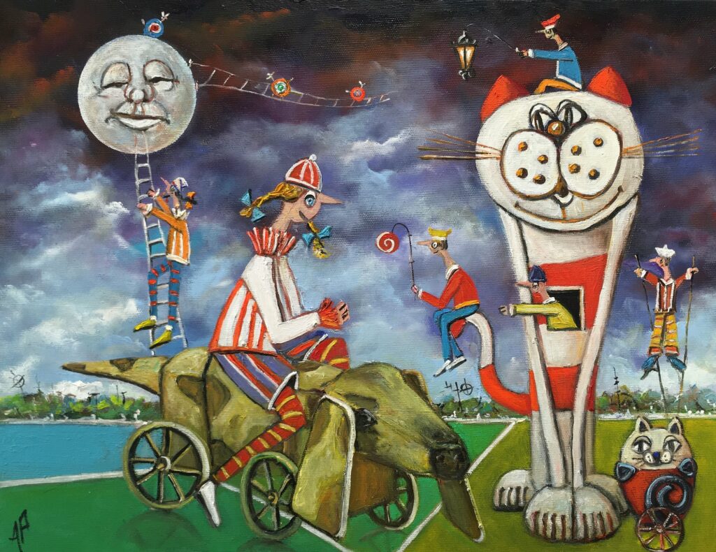Hundreds of paintings and sculptures are in collections all over the world, including USA, New Zealand and even Afghanistan also in all European countries. Currently inspired by ceramic art in a funny way trying to tell about human passions. Behind the fairy-tale decorations are hidden the deepest human passions and desires. Canvas stretched on wooden frame. Colors of the painting may slightly differ from photos due to screen settings.