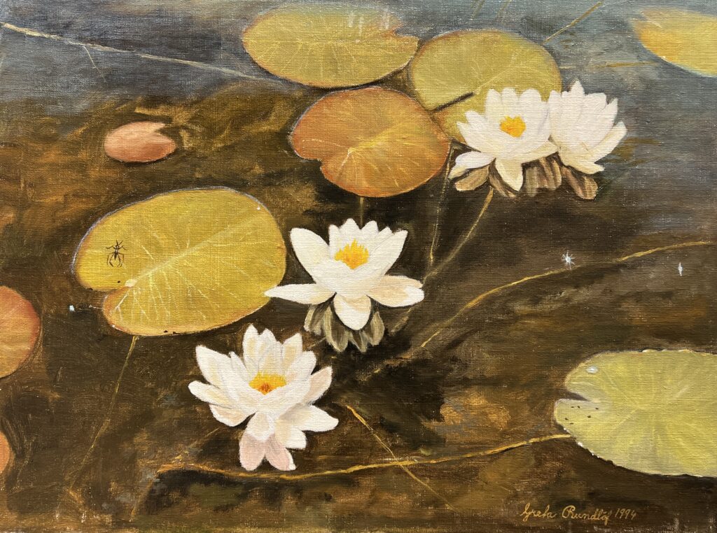 The composition is balanced and contemplative, composed with the eye of a naturalist and the hand of a painter steeped in traditional realism. Soft, muted greens and ochres dominate the palette, allowing the crisp white of the blossoms to emerge with quiet brilliance. Subtle reflections, delicate shadows beneath the lily pads, and even the inclusion of a small water insect on the nearest leaf enhance the tranquil intimacy of the scene.