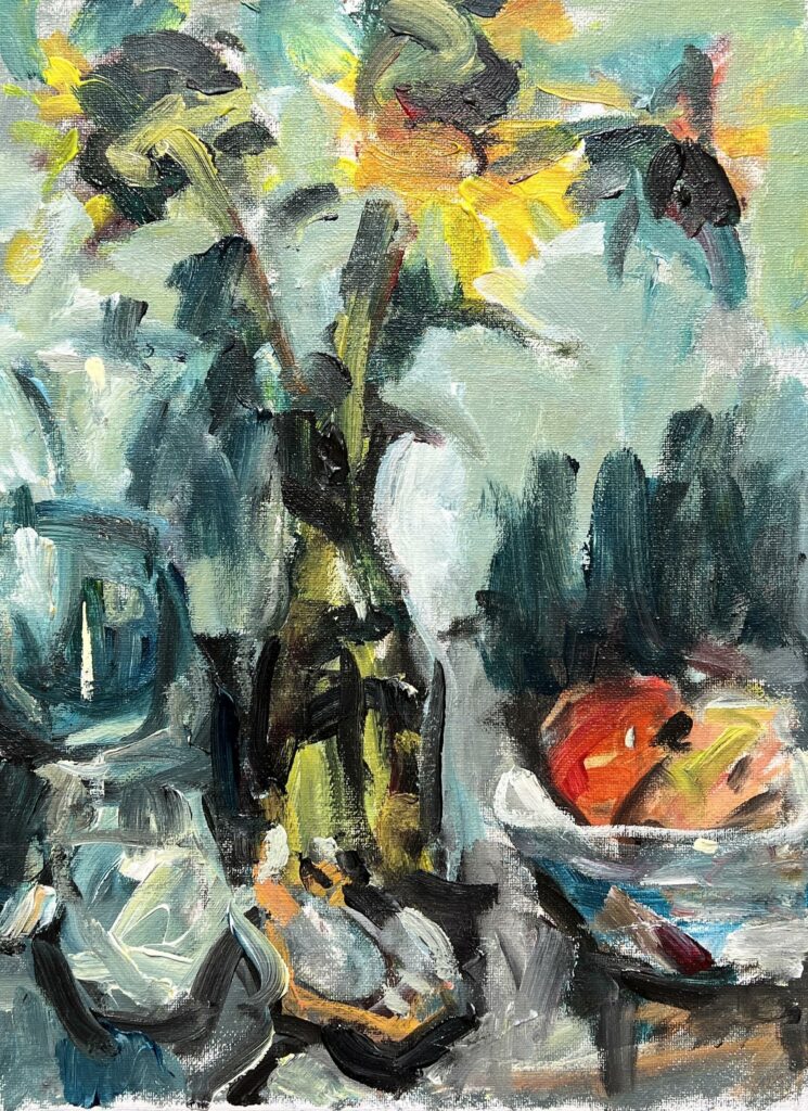 In this captivating piece, one encounters an exuberant dialogue between light and texture, reminiscent of the audacious brushwork that marked the post-impressionist movement. The sunflowers, central to this composition, appear to dance in a luminous haze, their vibrant yellows almost playfully challenging the viewer. They stand proudly in a glass vase that reflects abstracted, shimmering light on the tableauβs left side, enhancing the piece's dynamic depth.
