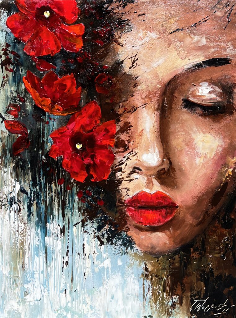 In this captivating composition, the viewer is drawn into an ethereal world where the delicate harmony of abstraction and figuration beautifully unfurls. The painter's palette is dominated by the vibrant reds of luscious poppies, juxtaposed with soft, earthy hues. These colors dance across the canvas, evoking a sense of passionate serenity. The enigmatic face, bathed in gentle light and shadow, offers a sublime contrast to the expressive floral forms.