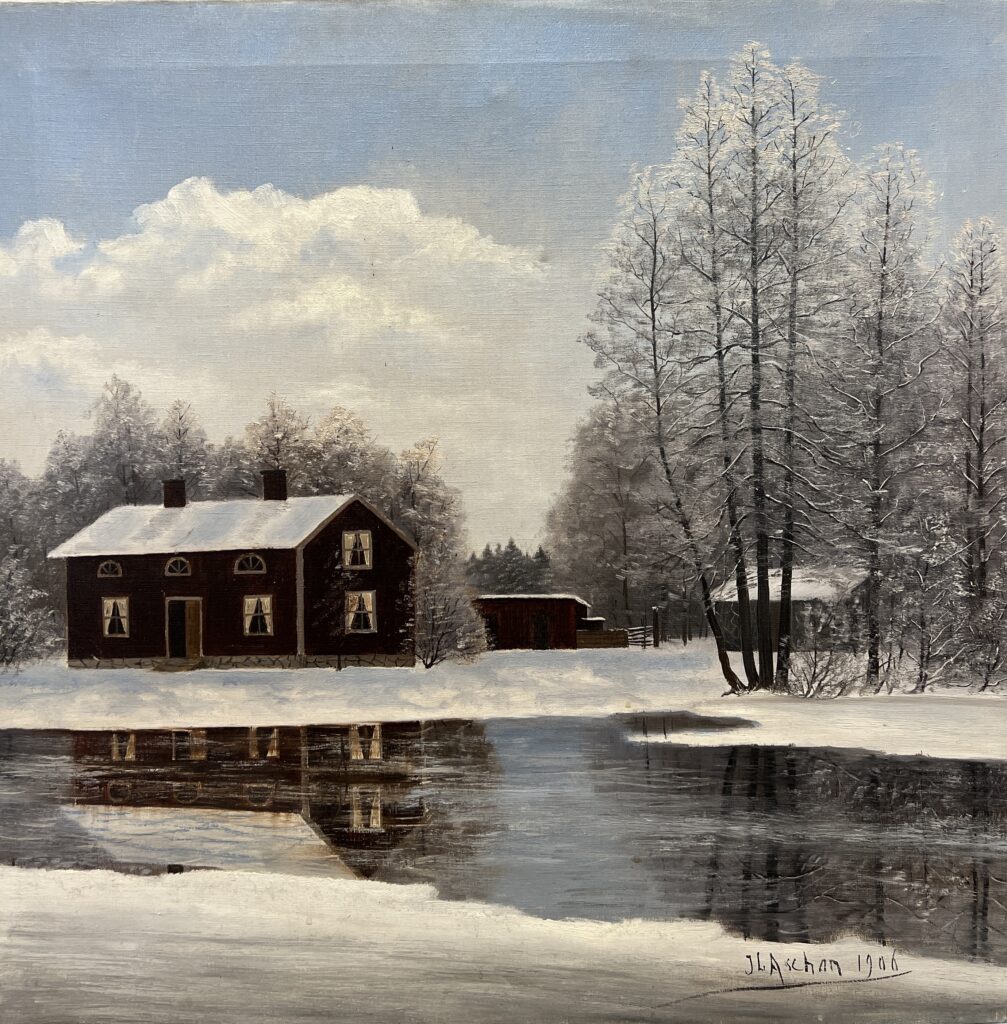 A stately country home rests beside a mirror-flat river, its dark faΓ§ade and snow-capped roof crisply reflected in the glassy water. Surrounding birches stand draped in winter’s hush, their lacy branches etched against a pale blue sky. Through meticulous handling of light and shadow, the artist captures a moment of serene stillness, where architecture and landscape unite in crystalline harmony.