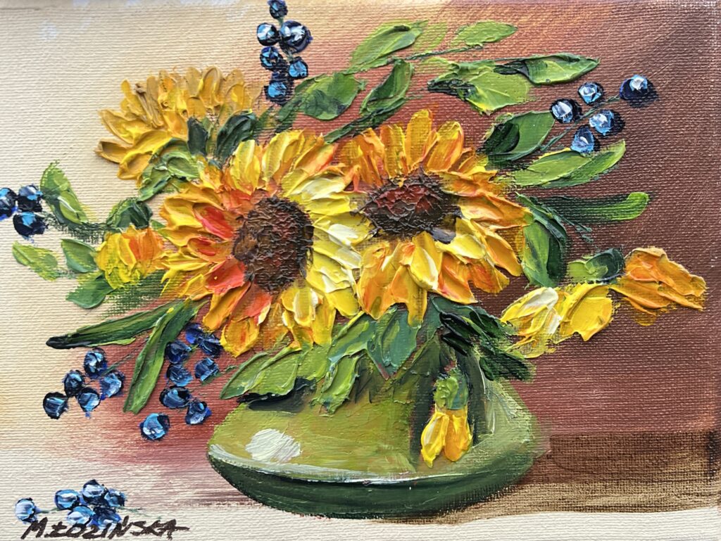 In this vivacious display of color and texture, the artist conjures a bouquet that feels almost alive with movement and vitality. Two luminous sunflowers command the center, their vibrant petals cascading in shades of sunny yellow and fiery orange, contrasted by the lush, green foliage that dances around them. The rich impasto technique lends depth and a tactile quality, inviting viewers to almost feel the petals' silken edges.