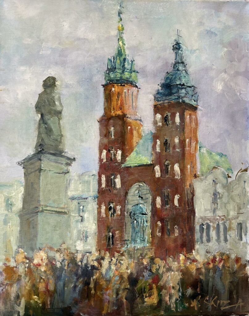 A symphony of architectural splendor and vibrant urban life, this evocative canvas captures the majestic St. Mary’s Basilica standing sentinel over a bustling town square. Rendered with loose, energetic brushstrokes reminiscent of the Impressionists, the artist infuses the scene with a sense of movement and immediacy. The dominant red hues of the church, contrasted against the cool, misty skyline, create a dynamic interplay of warmth and serenity. The crowd below, suggested through a tapestry of blurred, multicolored forms, adds to the liveliness, inviting the viewer to imagine the vibrancy of city life. This work is a delicate dance of color and light, a fleeting moment immortalized on canvas.