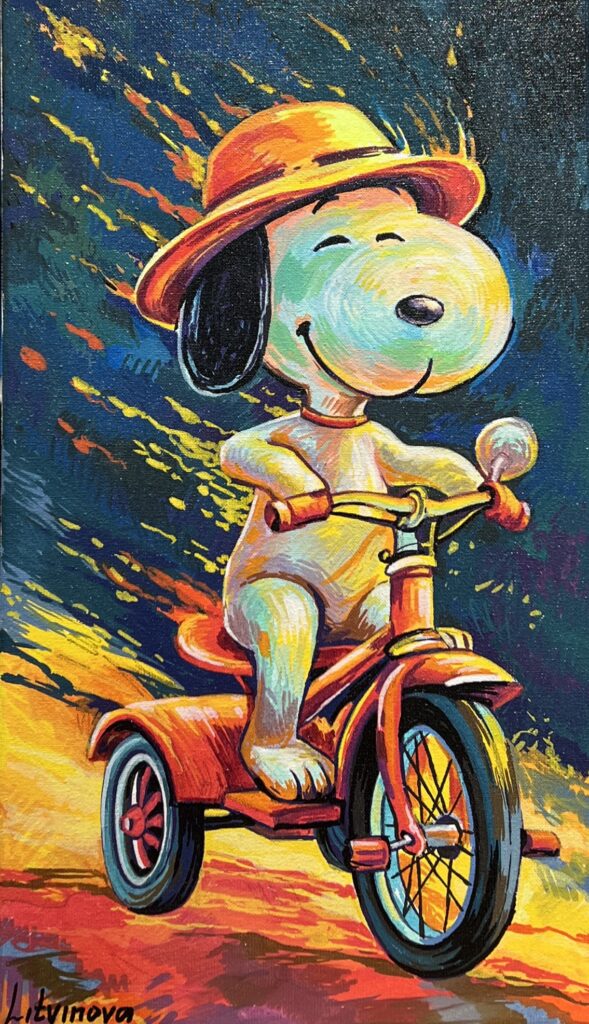 Radiating an exuberant joie de vivre, this delightful artwork bursts with whimsical charm and vibrant energy. Our iconic protagonist, joyfully pedaling a tricycle, is bathed in a kaleidoscope of colors that dance across the canvas with unrestrained playfulness. The bold strokes and dynamic movement evoke a sense of freedom and nostalgia, reminiscent of carefree childhood days.