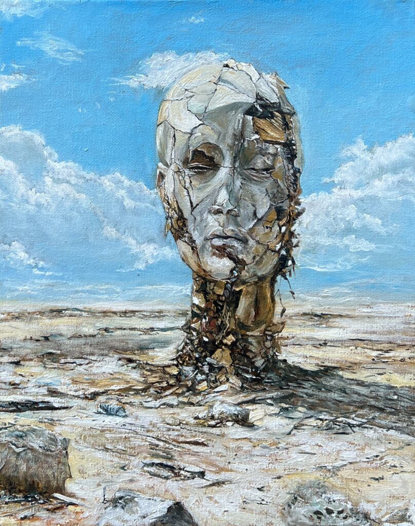 This captivating work exudes a surreal elegance, seamlessly blending elements of Dali-esque dreamscapes with an introspective modernity. The crumbling visage rises solemnly from an arid desert, its cracked surface telling tales of time's relentless passage. The artist's palette, dominated by soft earth tones and contrasted by a vivid, azure sky, invites viewers into an almost ethereal meditation on the fragility of existence. The meticulous brushstrokes and textured layers provide a tactile depth, drawing the eye to the melancholic yet serene expression of the face. This piece cleverly balances chaos and tranquility, making it a testament to the enduring human spirit amidst the sands of time.