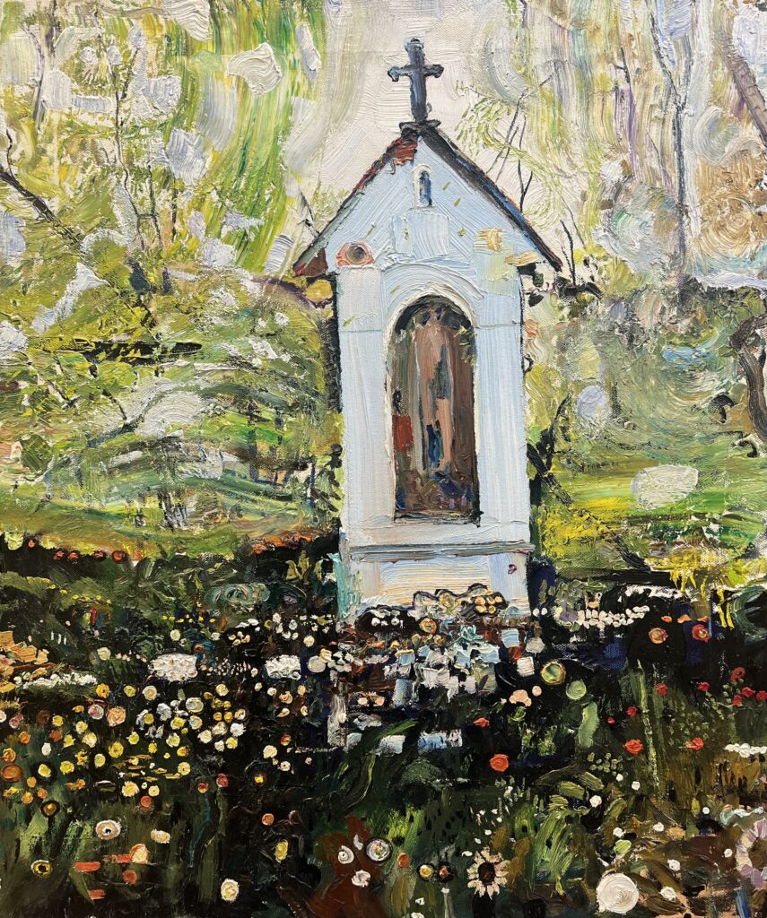 Nestled in a riot of wildflowers, this charming roadside shrine stands as a testament to faith, nature, and perhaps a divine appreciation for landscaping. With expressive brushwork and a vibrant palette, the artist captures the harmony between the spiritual and the earthly, where devotion meets daisies.