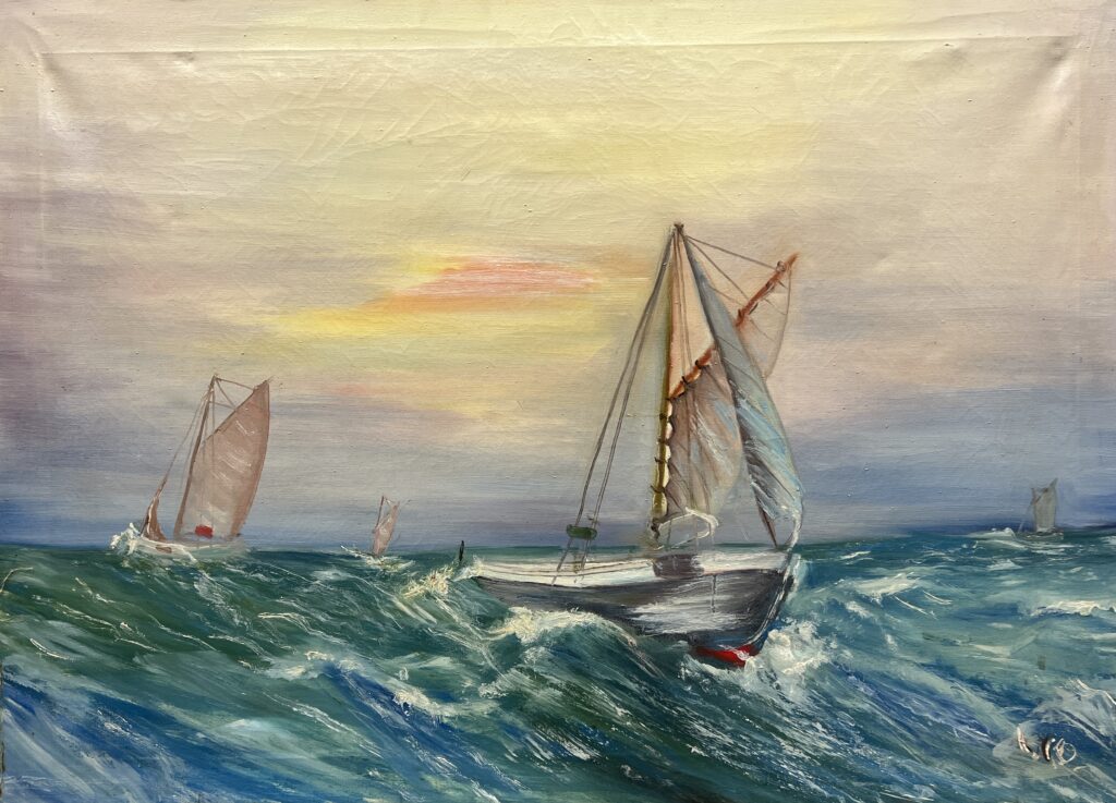 This maritime painting captures the dynamic and untamed energy of the open sea. The composition features a sailing vessel navigating through turbulent waters, its sails billowing in the wind. The artist skillfully conveys the motion of the waves, using rich blues and whites to depict the ocean’s power. The warm hues of the sky contrast with the cool tones of the sea, adding depth and atmosphere to the scene. In the background, additional sailboats suggest a journey filled with both challenge and guidance. The painting evokes a sense of adventure and resilience, celebrating the enduring spirit of sailors braving the elements.