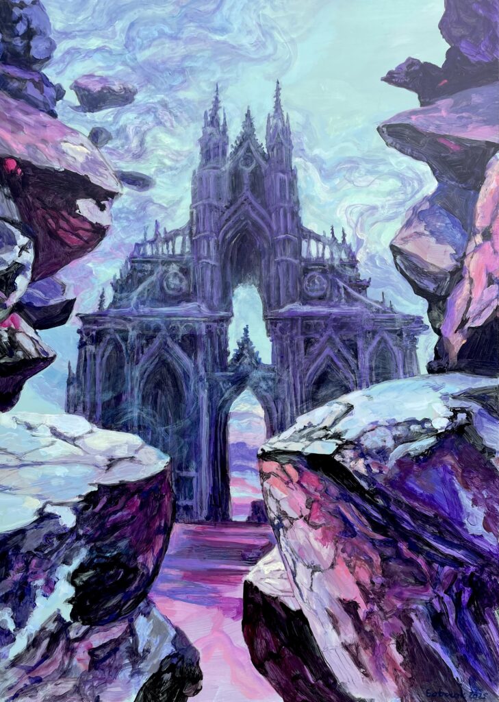 In this enchanting piece, a fantastical cathedral emerges from the mist, suspended between ethereal realms. The artist’s mastery of surrealist motifs transports us into a dreamscape where Gothic grandeur defies earthly bounds. The dramatic play of purples and blues evokes a twilight realm where reality and fantasy seamlessly intermingle. Swirling clouds echo the dynamic fluidity of movement, framing the architectural marvel. Delicate yet imposing, the spires rise with poignant elegance, while the floating rocks, touched by a whimsical palette of pinks and violets, add a mystic flair. This composition, with its exquisite balance of light and shadow, invites an exploration of the metaphysicalβ€”a journey into the imagination's untamed terrain.