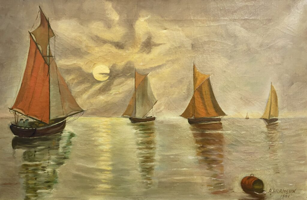 This atmospheric maritime painting captures a serene seascape at dusk. The composition features several sailboats gliding across calm waters, their orange sails illuminated by the golden hues of the setting sun. The soft, diffused light creates a tranquil mood, while the gentle ripples on the water reflect the boats and the sky, adding depth and movement to the scene. The artist, A. Parkinson, skillfully employs warm tones and expressive brushwork to evoke a sense of nostalgia and maritime tradition. The presence of a floating barrel in the foreground subtly hints at human activity and seafaring narratives. This piece exemplifies the timeless allure of maritime art and the beauty of coastal landscapes.