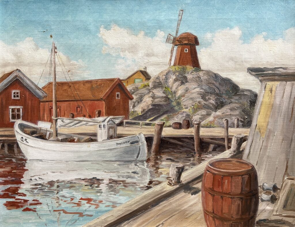 Step into the charm of a bygone era with this captivating maritime scene, where the rustic beauty of Scandinavian coastal life comes to life. With its vivid depiction of red wooden boathouses, a gently bobbing fishing vessel, and a timeless windmill perched atop rugged rocks, this artwork evokes a sense of tranquility and nostalgia. The warm sunlight dances on the water, reflecting a peaceful harbor untouched by time.