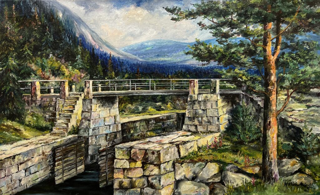 A sturdy stone weir spans a crystalline mountain waterway, its weathered blockwork and iron railing harmonizing with the surrounding pines and distant blue peaks. Sunlit moss and wildflowers soften the man-made structure, while the rushing current below and cloud tipped ridges above evoke the timeless dialogue between human craft and alpine nature.