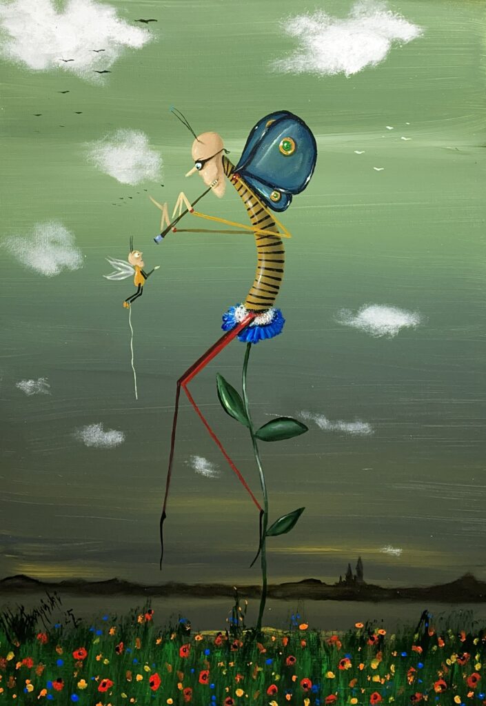His art is inspired by Bosch and Holland art masters. He designed theater set for “Life is Beautiful”.
