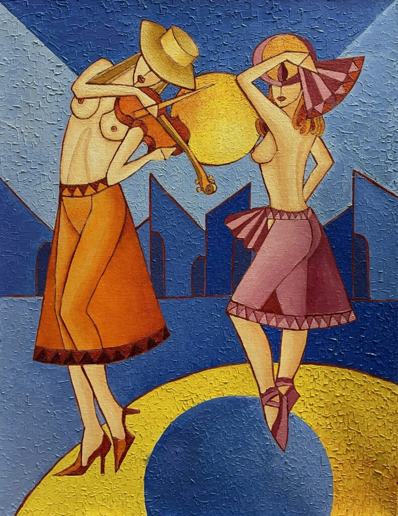 In this composition, we witness an exuberant dance of color and form, where the painterβs playful orchestration of geometry meets the vividness of Fauvist inspiration. The scene is alive with rhythm, presenting two elegantly poised figures, capturing the essence of a timeless serenade under a brilliant sun. The daring juxtaposition of warm oranges and cool blues creates a dynamic tension, evoking both vibrancy and tranquillity.