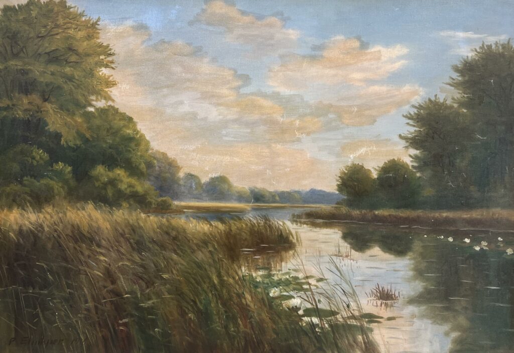 In this enchanting landscape, the artist masterfully captures the serene dance of nature. The delicate brushstrokes echo the whispers of Impressionism, as a soft palette of greens and golds envelops the viewer in tranquility. The water’s mirrored surface, punctuated by the gentle presence of water lilies, reflects not only the lush foliage but also the tender embrace of a cloud-laden sky.