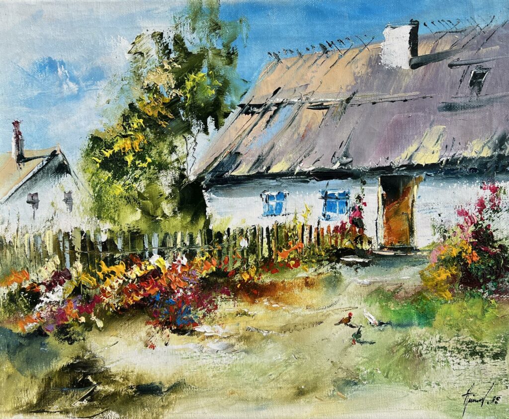 Ah, behold this captivating pastoral symphony, where the canvas sings with bucolic charm and the echoes of Impressionist whispers. The artist deftly captures the solace of a countryside idyll, where a quaint cottage nestles amid a tapestry of resplendent flora. The roof, an earthy mosaic, contrasts with vibrant blossoms that dance playfully in hues of crimson, gold, and violet against the azure sky.
