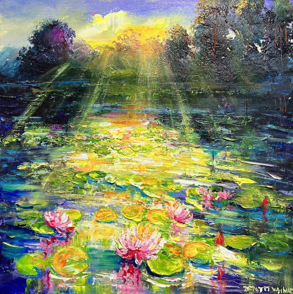 In a dazzling ballet of color and light, this enchanting tableau draws us into a dreamlike realm where nature's elegance unfolds with sublime serenity. Bathed in the golden whispers of a sunlit morning, lilies emerge from their verdant cradle, their petals flamboyantly pink, contrasting against the lush greens that ripple in exquisite harmony. The composition skillfully orchestrates a vivid chromatic symphony, reminiscent of impressionistic masterworks, where every brushstroke pulsates with life and vigor. The atmospheric depth is achieved through a masterful interplay of warm and cool hues, guiding the eye through a tapestry of reflections that seem to dance upon the water's surface. With echoes of Monet’s beloved water gardens, this piece captivates, inviting one to linger in its tranquil embrace, lost in the poetry of light.