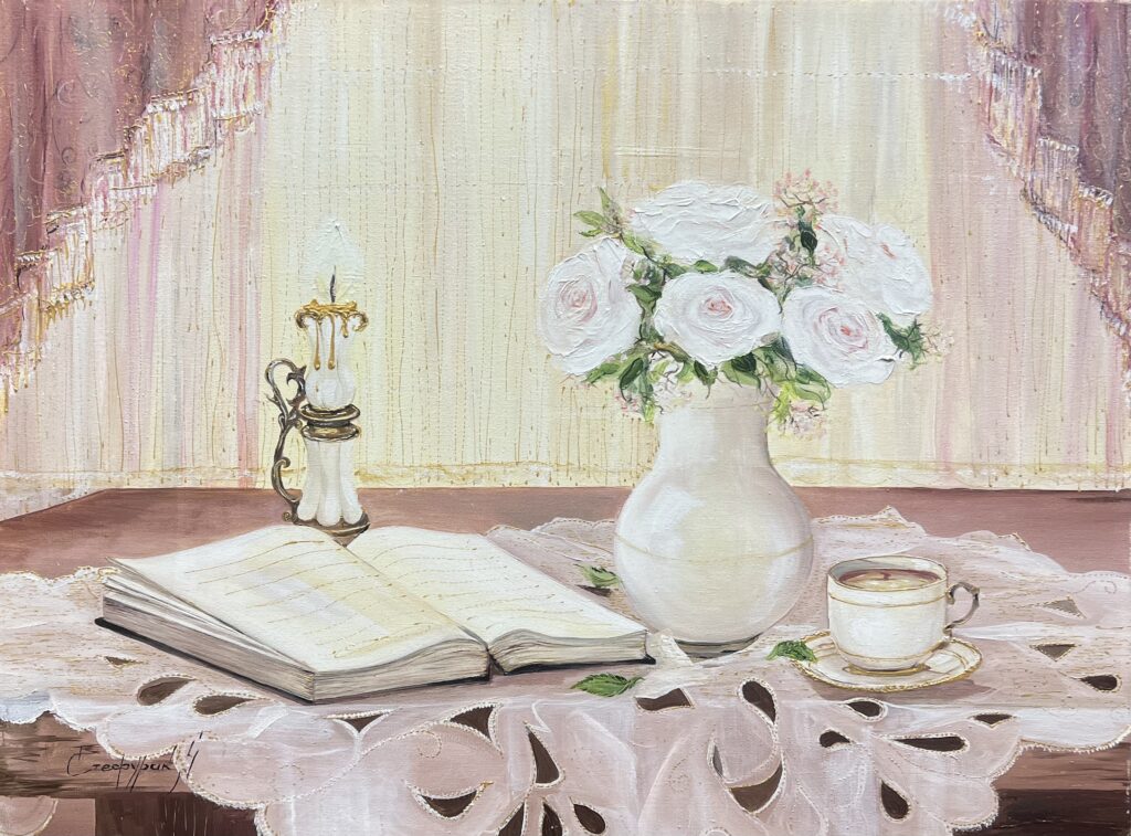 Immerse yourself in a world of tranquility and grace with Serenity in Elegance, a still life that celebrates the art of refined living. This exquisite composition captures a delicate harmony between literature, nature, and ritual an invitation to pause and embrace the beauty of the moment.