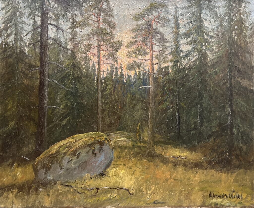 This evocative landscape immerses the viewer in the stillness and solitude of a dense forest, where nature’s quiet presence dominates the scene. The composition is marked by towering pine trees, their vertical forms framing the central space, and a large moss-covered boulder resting in the foreground as if frozen in time.