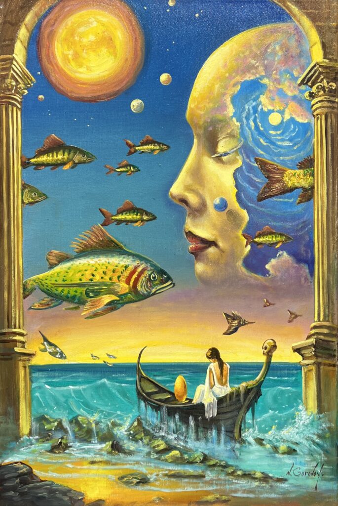 In this mesmerizing tableau, the artist navigates the enigmatic border between dream and reality. A celestial visage, mirroring the mysteries of the cosmos, hovers in serene contemplation, its lunar face a gentle nod to surrealism's embrace of the fantastical. The kaleidoscope of vibrant piscine wanderers defying gravity adds a playful twist, reminiscent of Magritteβs whimsy. A solitary figure in a gondola suggests an odyssey through the subconscious, where land and sea converge in paradoxical harmony. The palette, with its opulent blues and effulgent yellows, evokes a twilight reverie, drawing us inexorably into its serene depths. A symphony of elements in surreal juxtaposition beckons the viewer to pause and ponder the delightful absurdities of existence.