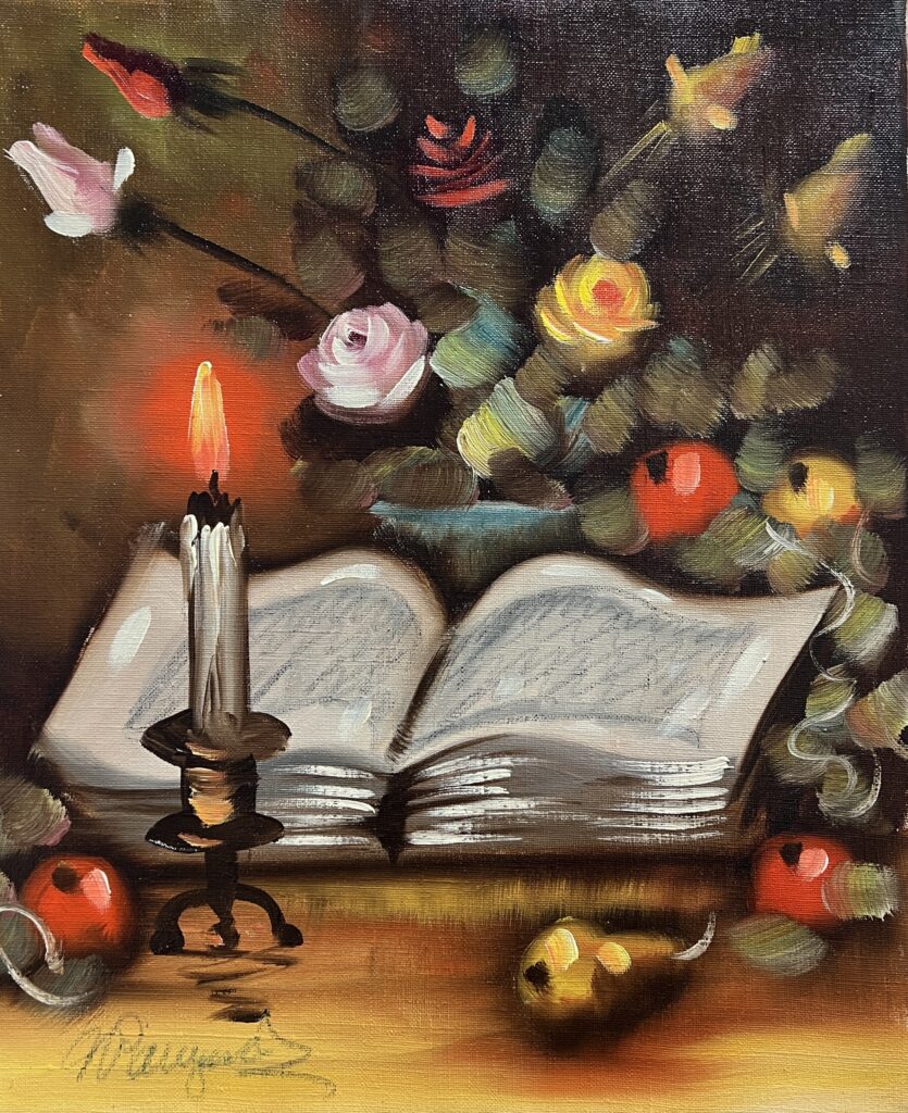 Silent Narrative invites the viewer into an intimate, contemplative space where symbolism and atmosphere converge. A solitary candle burns beside an open book its pages suggestively blurred casting warm light across the table and onto surrounding fruits and blooms. The composition, rendered in expressive, rounded strokes, bridges the lyrical and the surreal, evoking themes of knowledge, transience, and inner illumination.
