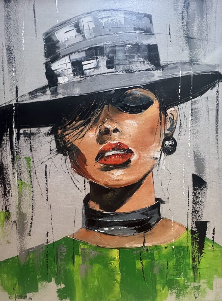 A striking blend of mystery and modernity, this captivating portrait draws the viewer into a world of glamorous intrigue. The artist's deft hand combines broad, expressive brushstrokes with a bold palette dominated by deep greens and shadowy grays. The subject's enigmatic gaze, partially concealed beneath a dramatic hat, evokes a subtle nod to the elegance of film noir, while the vivid red lips exude an irresistible allure.