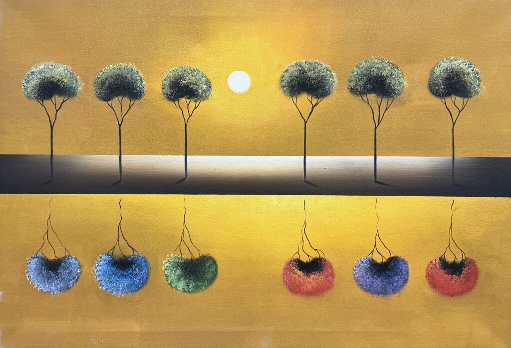 The mirrored reflection beneath introduces an unexpected chromatic exuberance; the trees transform into an arrangement of vibrant bursts—blues, greens, reds—suggesting a play of hidden emotions beneath the surface calm. The use of light and shadow masterfully creates depth, drawing the viewer into a contemplative dance between reality and illusion, making this piece a captivating meditation on nature and imagination.