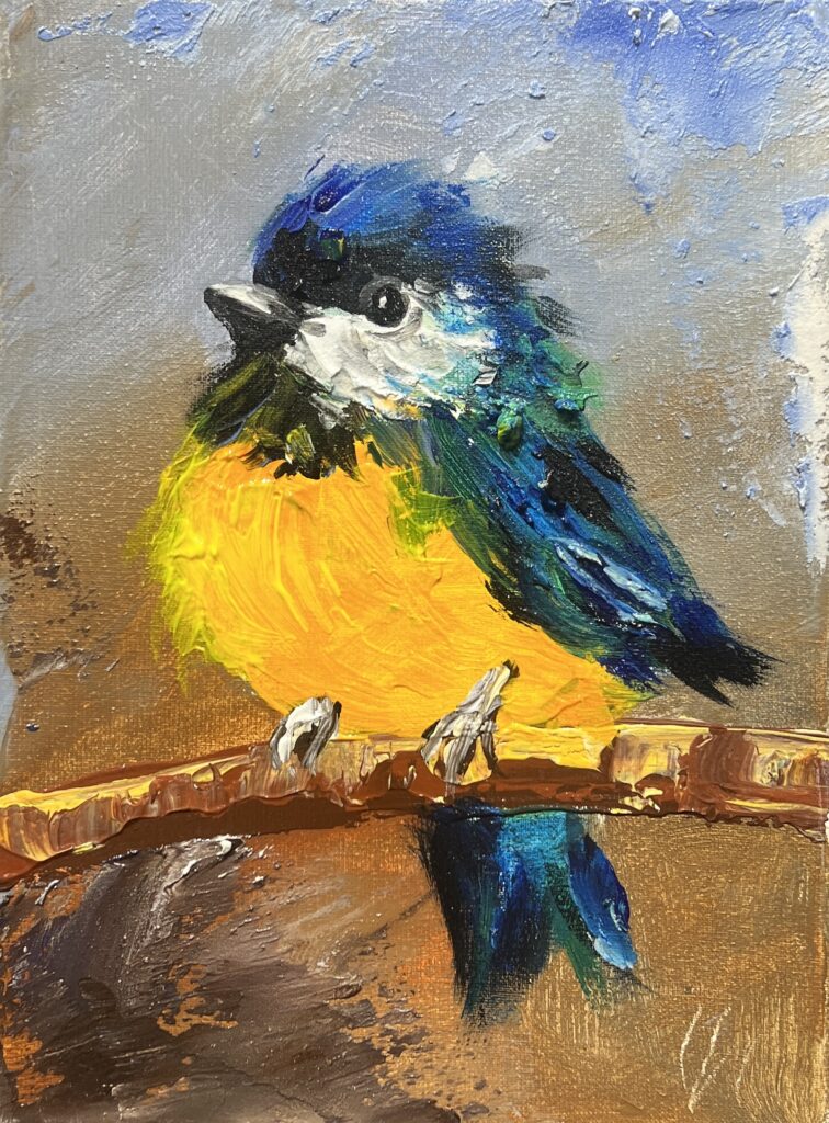 In this captivating canvas, a delightful avian protagonist perches with all the elegance of a feathered diva gracing a glamorous gala. Vibrant strokes of cobalt and emerald dance in a lively contrast against the radiant sunshine-yellow plumage, reminiscent of impressionistic ventures into the wild heart of nature’s palette. The background swirls gently in tones of sky and earth, providing a serene yet dynamic stage for our little muse.