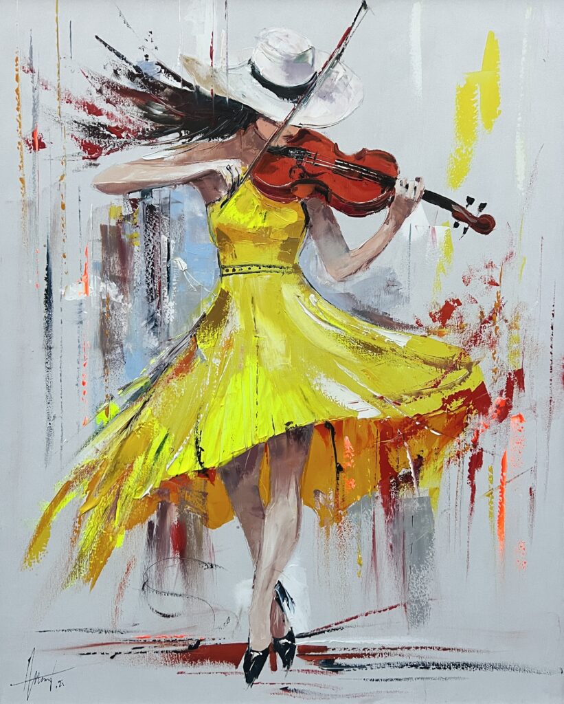 In a spirited whirl of color and movement, this captivating piece enchants with its symphony of hues and dynamic composition. The vibrant yellow dress, reminiscent of a sunbeam caught in a dance, dominates the canvas, while the crimson violin adds a melodious contrast that sings to the viewer's soul. The artist masterfully plays with textures, allowing brushstrokes to create a sense of energy and flow, as if the subject herself were in the midst of an impromptu street performance.