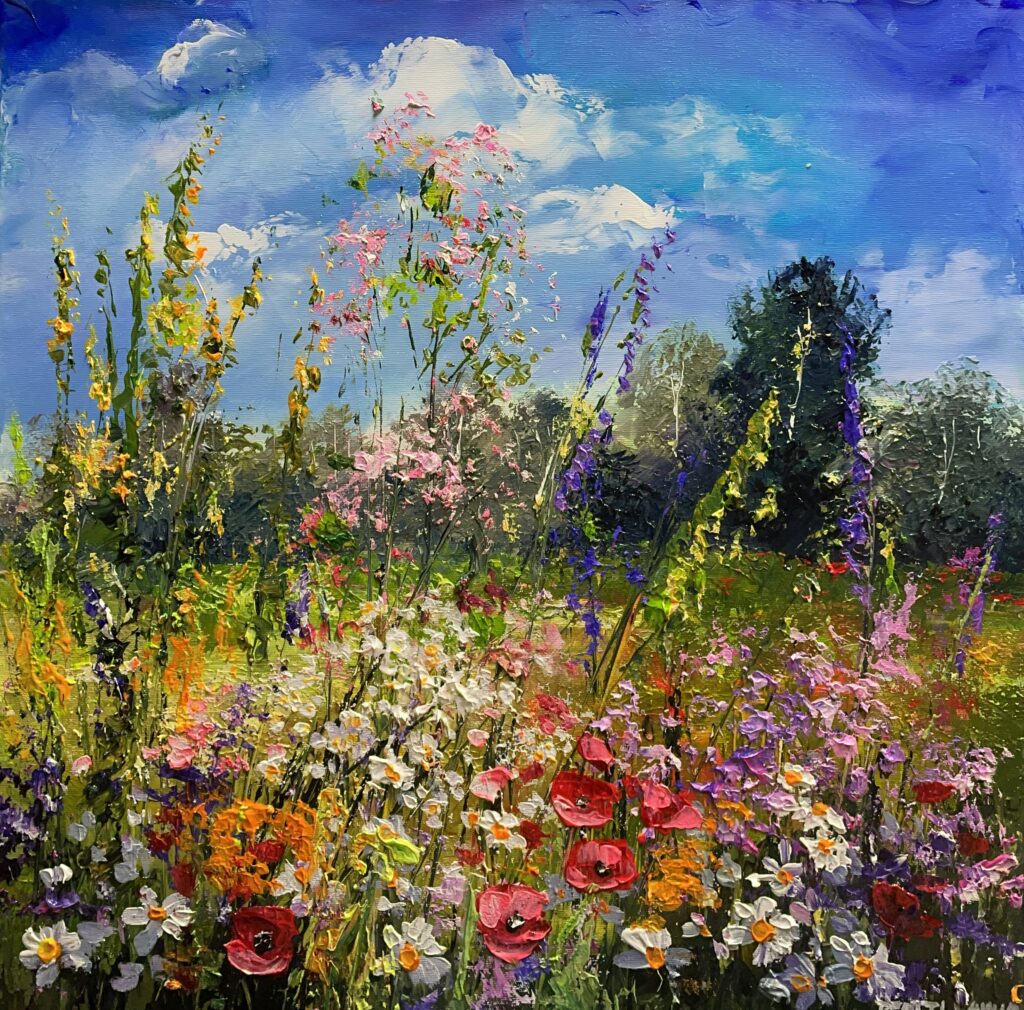 In a riotous tapestry of color, this enchanting landscape captures the vigor and vivacity of a wildflower meadow in full bloom. The brushwork dances across the canvas with an audacious flourish, reminiscent of the Impressionists' devotion to capturing fleeting moments of natural beauty. Here, vivid reds and luminous purples entwine with delicate pastels, forming a harmonious yet exuberant chorus that sings of summer's splendor. The azure sky, dappled with cotton clouds, offers a tranquil backdrop, enhancing the lively chaos below. Masterful layering of texture and hue conjures a palpable depth, inviting the eye to wander and discover hidden nuances. This piece exudes an effervescent joy, capturing the untamed elegance of nature's garden in a way that is both spontaneous and timeless.