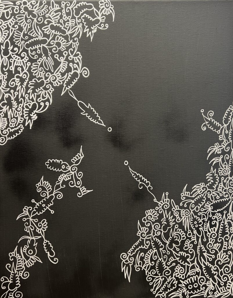 A delightful confection of monochrome whimsy, this artwork dances gracefully with an intricate tapestry of white patterns against a sumptuous ebony background. The playful flourishes evoke a baroque fantasy, embracing the viewer with their swirling elegance and delicate complexity. One might wonder if M.C. Escher himself whispered secrets into the artist's ear, inspiring the meticulous symphony of shapes and motifs that appear to converse across the canvas.