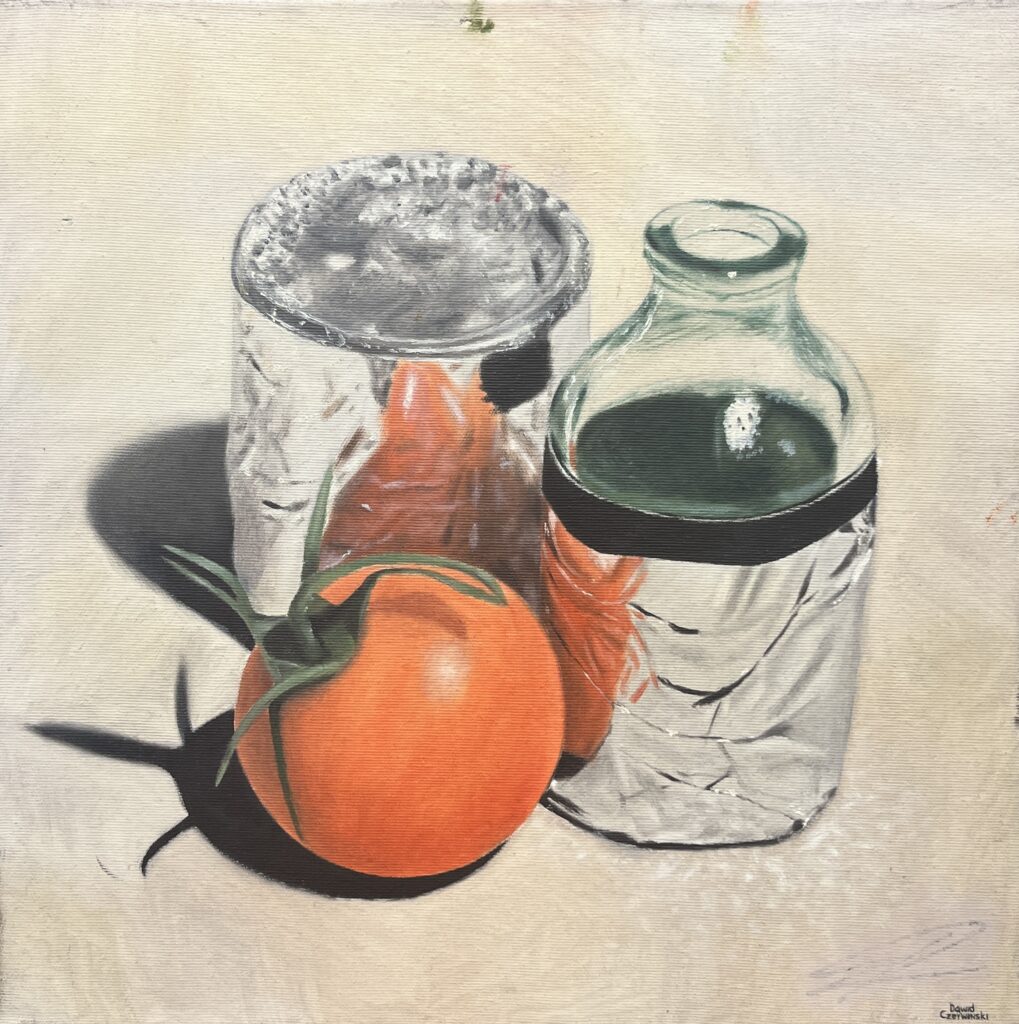 A quiet meditation on everyday objects, this oil study presents a single ripe tomato alongside two glass vessels sheathed in crinkled aluminum wrap. Crisp, directional light sculpts each surface—its gleam dancing across the reflective foil and pooling in the green-tinted glass. The warm orange of the tomato and the soft shadows grounding the composition create a harmonious balance between the organic and the manufactured. Through precise rendering and a restrained palette, the work elevates humble kitchen implements into a moment of contemplative beauty.