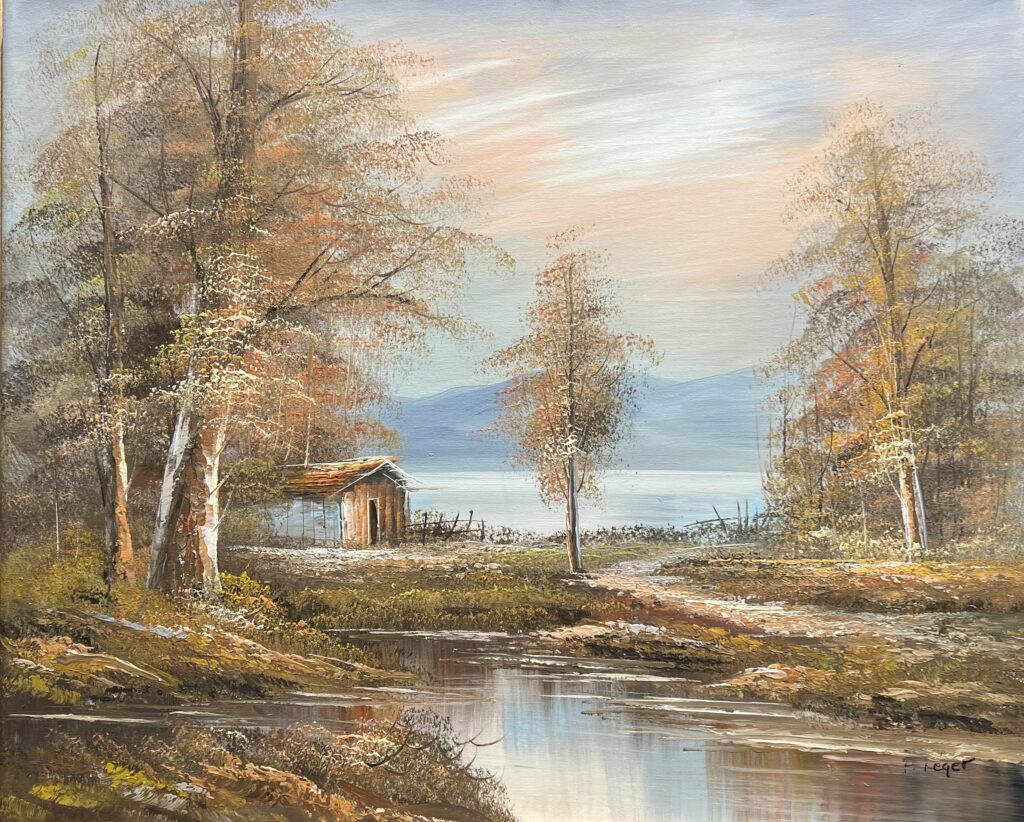 In this enchanting landscape painting, the artist masterfully captures the serene grace of an autumnal retreat. With delicate brushwork, the golden and amber hues of the trees dance against a tranquil, azure lake, evoking the quietude of a distant pastoral haven. The solitary cabin stands poised at the edge of a shimmering waterway, inviting the viewer into its gentle embrace, reminiscent of 19th-century Romanticism's reverence for nature.