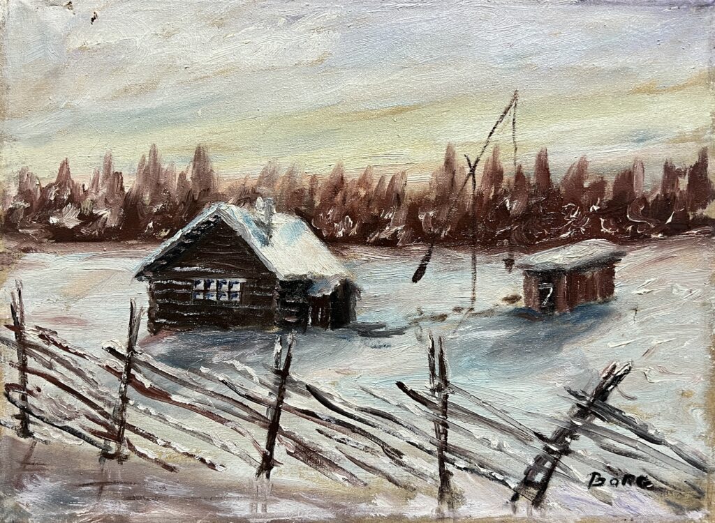 This captivating winter scene transports us to a serene, snow-covered landscape, where time seems to have paused in a delicate moment of hushed tranquility. The artist has masterfully employed a palette of muted browns, blues, and whites, evoking the chill of a crisp winter's day while infusing warmth through softly rendered brushstrokes. As the sun dips low, the sky spills a golden hue, casting a gentle glow over rustic cabins and frosty trees, reminiscent of the Impressionist fascination with light and atmosphere. The rough-hewn fence, leading the eye with an almost whimsical rhythm, adds a playful contrast to the painting's otherwise tranquil mood. This piece is a graceful homage to the quiet beauty of nature's winter slumber, capturing the heart with its charming simplicity.