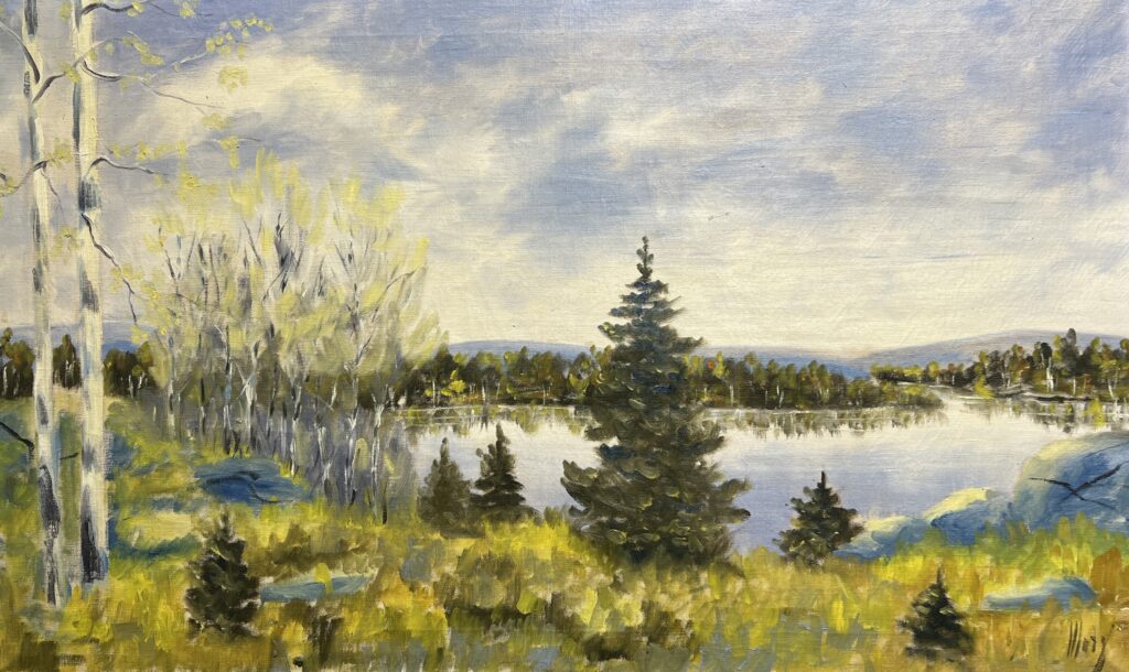 This enchanting landscape, a gentle nod to the Impressionist tradition, captures the serene beauty of a tranquil lakeside scene. The artist deftly employs a soft palette of blues, greens, and earthy ochres, inviting the viewer into a harmonious dance of light and shadow. The whispering birches to the left, seemingly swayed by an imperceptible breeze, form a delicate lattice of silver against the azure sky. Meanwhile, the stoic evergreens, standing guard over the glassy water, exude a timeless grace. This composition, with its masterful rendering of spatial depth, creates an atmosphere of quiet reflection and pastoral charm—a serene reminder of nature’s profound simplicity and elegance.