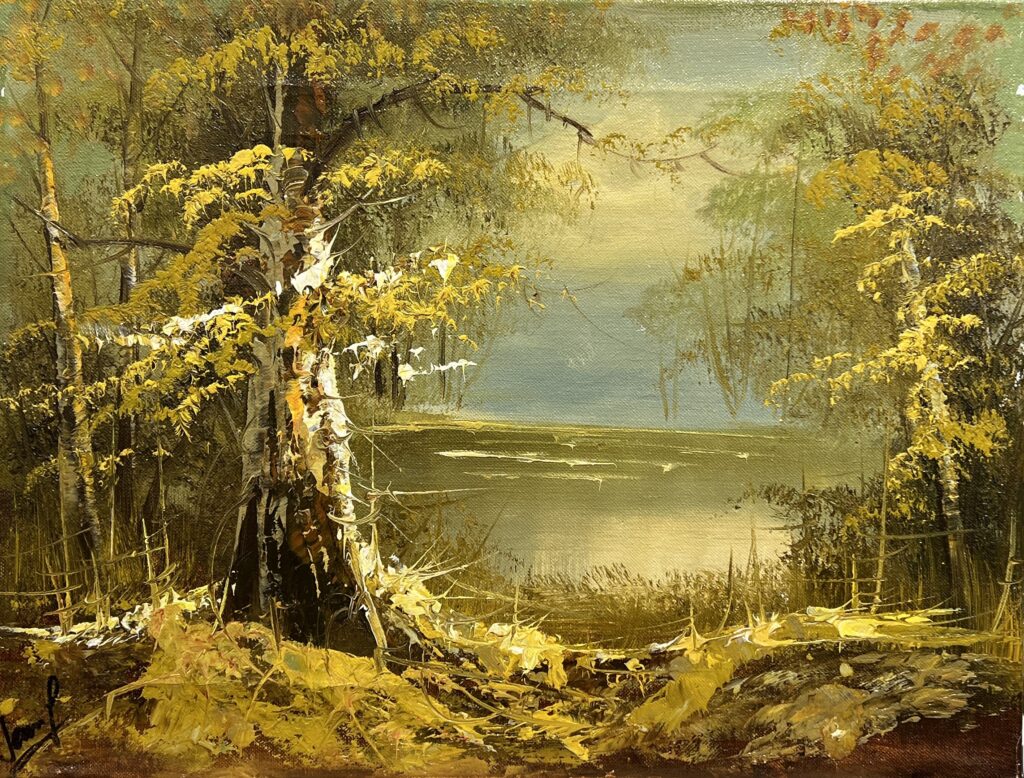 This evocative landscape invites us to a serene woodland scene where nature seems to breathe with a gentle rhythm. The artist masterfully employs a palette of earthy browns, vibrant yellows, and soft greens, creating a harmonious interplay of light and shadow that dances across the canvas. The composition, reminiscent of the Impressionist tradition, captures the ephemeral beauty of a tranquil forest by a languid lake. The textured application of paint adds depth and movement, highlighting the golden foliage as it contrasts with the subdued, misty horizon. An emotional resonance emerges, offering a reflective pause—a quiet moment suspended in time. The artwork’s lush atmosphere evokes both a sense of longing and peaceful contemplation, inviting the viewer to step into its embrace.