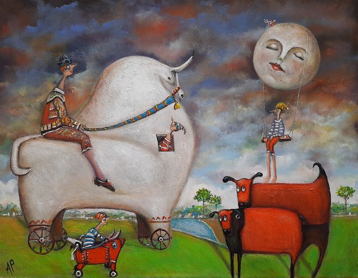 Hundreds of paintings and sculptures are in collections all over the world, including USA, New Zealand and even Afghanistan also in all European countries. Currently inspired by ceramic art in a funny way trying to tell about human passions. Behind the fairy-tale decorations are hidden the deepest human passions and desires. Canvas stretched on wooden frame. Colors of the painting may slightly differ from photos due to screen settings.