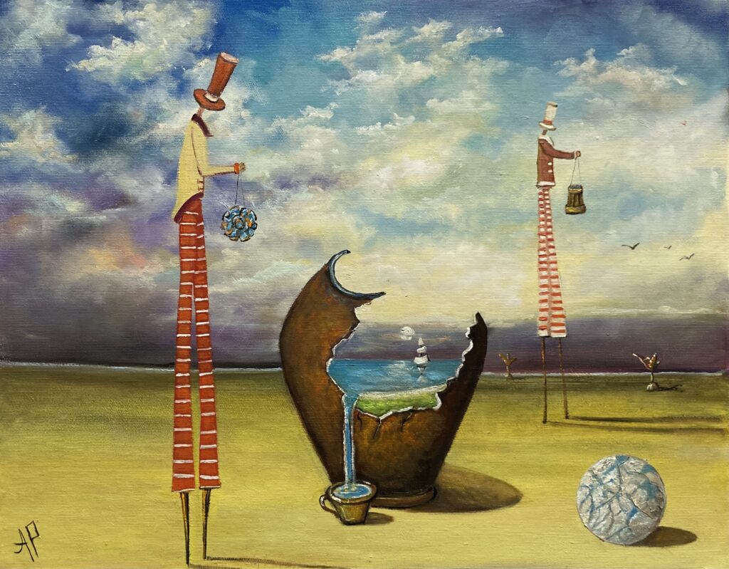 Hundreds of paintings and sculptures are in collections all over the world, including USA, New Zealand and even Afghanistan also in all European countries. Currently inspired by ceramic art in a funny way trying to tell about human passions. Behind the fairy-tale decorations are hidden the deepest human passions and desires. Canvas stretched on wooden frame. Colors of the painting may slightly differ from photos due to screen settings.