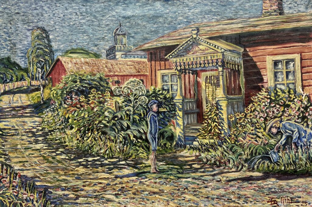 Bathed in soft, dappled sunlight, a humble wooden cottage stands amid lush, overgrown flower beds, where two figures tend the gardenβs gentle riot of blooms. The artistβs rhythmic, pointillist-inspired strokes lend a shimmering vitality to every leaf and stone path, while the distant church tower anchors the scene in a timeless rural calm. Through its harmonious interplay of warm reds and verdant greens, the painting celebrates the simple grace of everyday life in full bloom.
