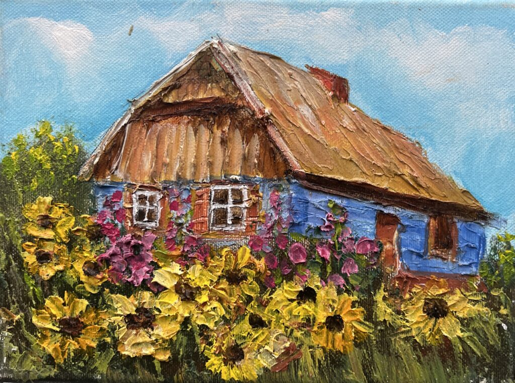 A rustic symphony of vibrant hues, this enchanting piece captures the idyllic charm of a country cottage nestled amidst a sea of sun-kissed blossoms. The artist’s brush dances with joyful abandon across the canvas, employing thick, impasto layers that animate the flowers in the foreground with unparalleled vitality. The cobalt blue walls of the cottage stand proudly under a thatched roof, their rustic elegance framing the scene with a nostalgic whisper of simpler times.
