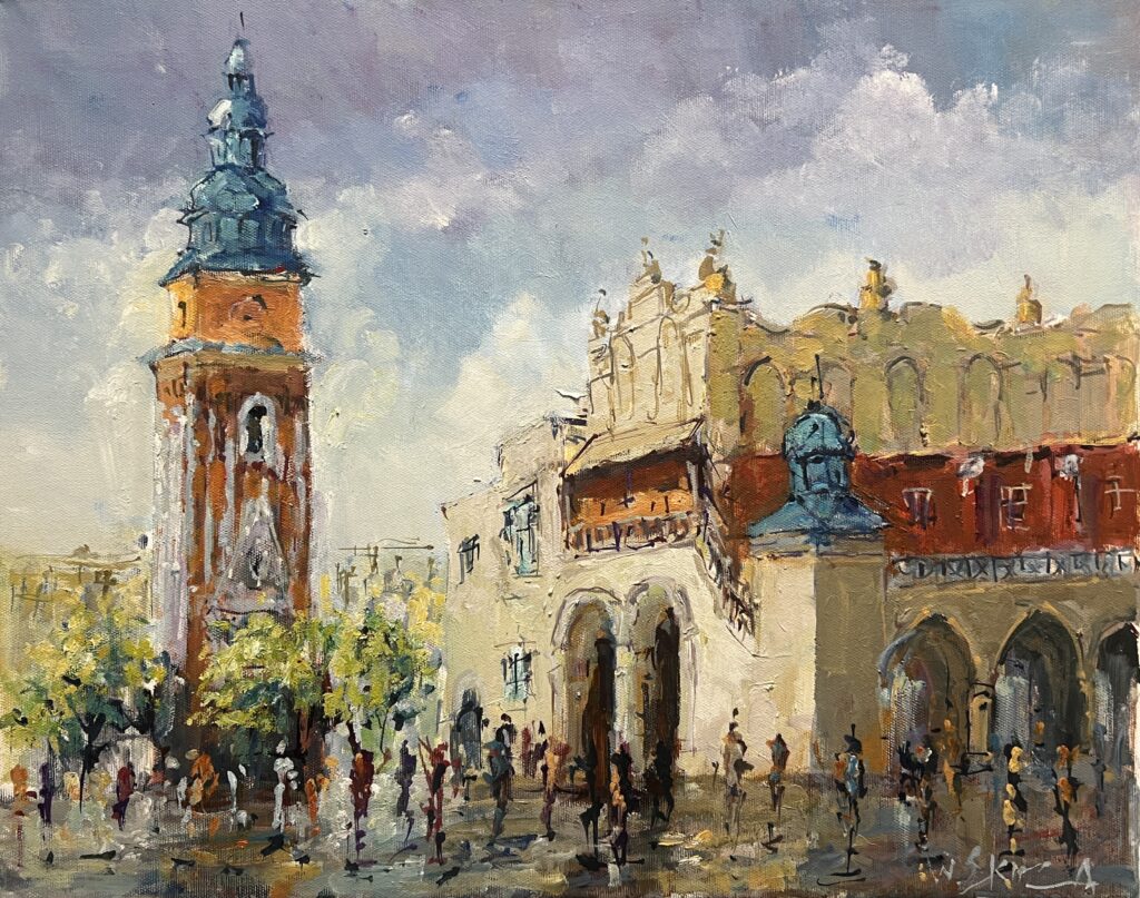 This captivating painting gracefully transports us to the historic heart of Krakow, suffused with a vibrant interplay of colors reminiscent of the Impressionist flair. The artist skillfully captures the iconic Town Hall Tower bathed in the warm glow of a sunlit day, where splashes of terracotta and azure dance harmoniously against a backdrop of a soft, dappled sky. The bustling life of the square is conveyed through fluid brushstrokes, suggesting figures animated in motion, walking amongst verdant trees. The architecture emerges with a textured pastiche of ochre and sienna, exuding both grandeur and warmth. It’s a canvas infused with lively spontaneity, inviting the viewer to step into a moment where history and vivacity converge in an enchanting tableau.