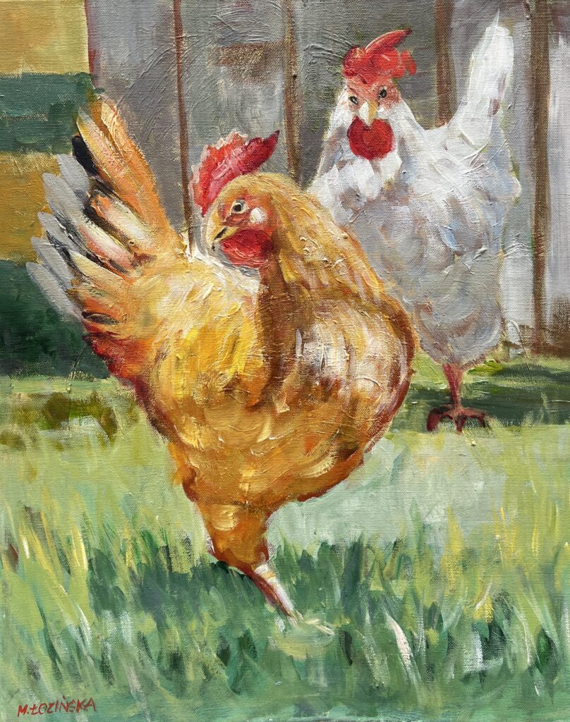In a mesmerizing dance of feathers and light, this delightful pastoral scene invites us into a whimsical world where chickens, with all their clucking charm, are the undisputed protagonists. The brushwork, lush and vivacious, captures the textural play of golden plumage against a soothing tapestry of greens, reminiscent of the Impressionists’ love for capturing fleeting moments. The composition, delightfully balanced, allows our eye to wander from the proud strut of the foreground hen to the curious posture of her companion. The artist conjures a harmonious blend of warmth and joy, where the sunlit palette exudes a cheerful vigor. A perfect encapsulation of rustic elegance, this piece brings a touch of the familiar countryside into any refined collection.