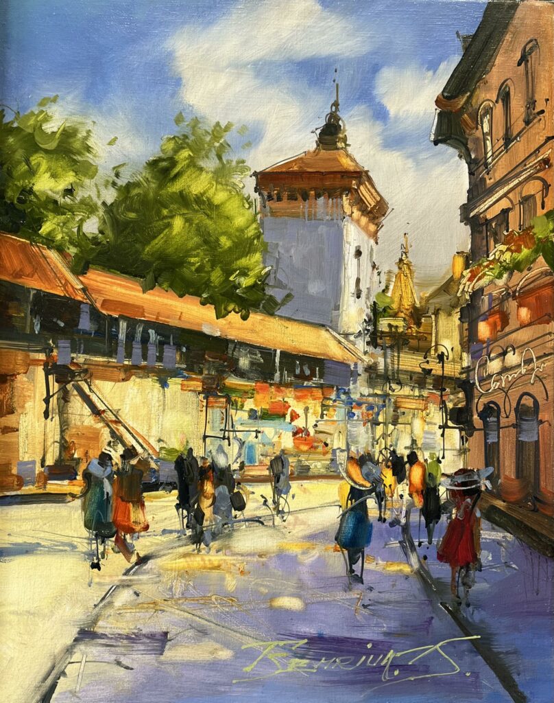 In this captivating tableau, the bustling energy of a sunlit street comes alive under the brush of a master who dances between impressionism and modern realism. The palette bursts with vibrant oranges and deep greens, each stroke breathing life into an everyday scene imbued with whimsy. The charming interplay of light and shadow draws the eye from the rich terracotta rooftops to the ethereal clouds drifting lazily above. Figures meander along the street, rendered in expressive, fluid lines that whisper tales of a bygone era. The central tower stands sentinel, adding structure to the scene's effervescent dynamism. This piece is a vivid ode to urban vibrancy, a testament to the joyous symphony of daily life captured in a perfectly balanced composition.