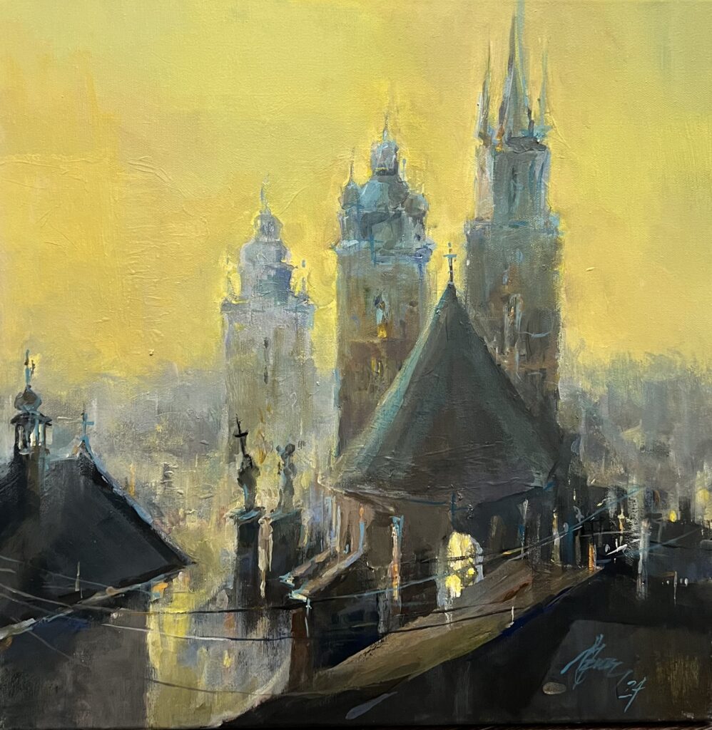 Technique : Maciej Szwec uses a layered, impressionistic technique, with soft, blended brushstrokes in the background and slightly more defined lines for the architecture. This approach blurs the boundaries between the light and the buildings, giving the impression of glowing towers rising from the misty urban environment. The spires of the towers and rooftops are delicately rendered, with the surrounding buildings depicted in a looser, more abstract fashion. The inclusion of power lines adds an industrial, modern element to the otherwise historical scene.