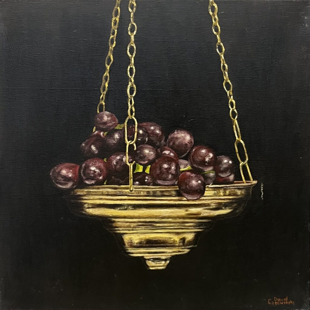 In this refined still life, a cascade of ripe, wine-dark grapes rests in a gleaming, suspended brass bowl, its delicate chains highlighting the fruitβs weight and the vesselβs elegance. Against a velvety black ground, the luminous metal and plump berries command attention, evoking both the luxury of abundance and the transience of natureβs bounty. Through meticulous rendering and dramatic contrast, the composition transforms a simple harvest into a moment of quiet grandeur.