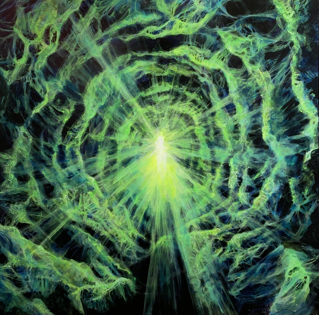 Behold a mesmerizing dance of luminosity and shadow, where the very essence of a cosmic journey unfurls before your eyes. The artist employs a kaleidoscope of verdant greens and electric blues, gently drawing us into a vortex of light and mystery. The central glow, a radiant beacon, pierces through layers of entwined foliage and ethereal tendrils, embodying the transcendental allure of a distant nebula.