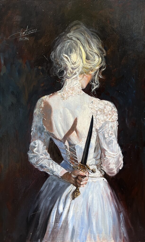 A delicate cascade of silvery hair spills over her shoulders, juxtaposed with the gleaming dagger she concealsβan arresting symbol of duality. This work, with its baroque embellishments and a subtle modern edge, invites us into a narrative of secrets and silent defiance, blurring the lines between vulnerability and power. A masterpiece where brushwork and narrative coalesce, leaving a resounding impression of bold sophistication.