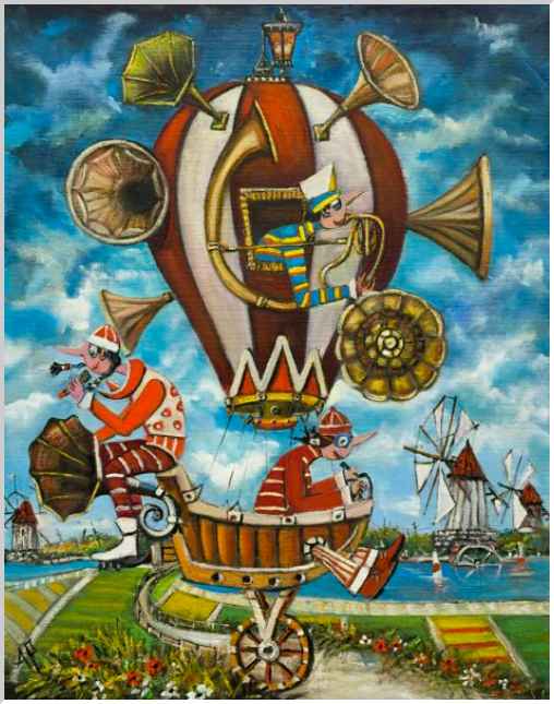 Hundreds of paintings and sculptures are in collections all over the world, including USA, New Zealand and even Afghanistan also in all European countries. Currently inspired by ceramic art in a funny way trying to tell about human passions. Behind the fairy-tale decorations are hidden the deepest human passions and desires. Canvas stretched on wooden frame. Colors of the painting may slightly differ from photos due to screen settings.